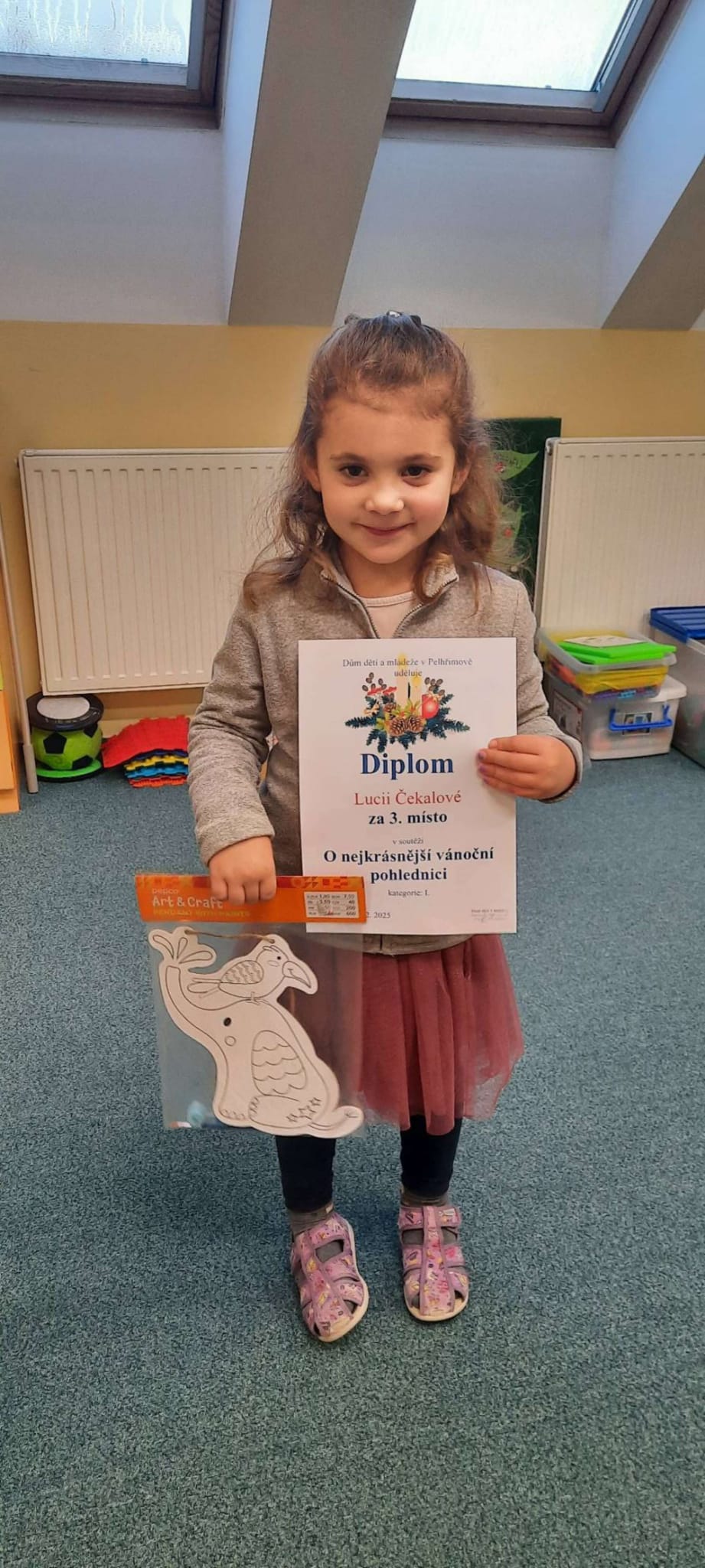 V soutěži o nejkrásnější vánoční pohlednici vyhrála třetí místo ve své věkové kategorii Lucie Čekalová ze třídy Broučků.